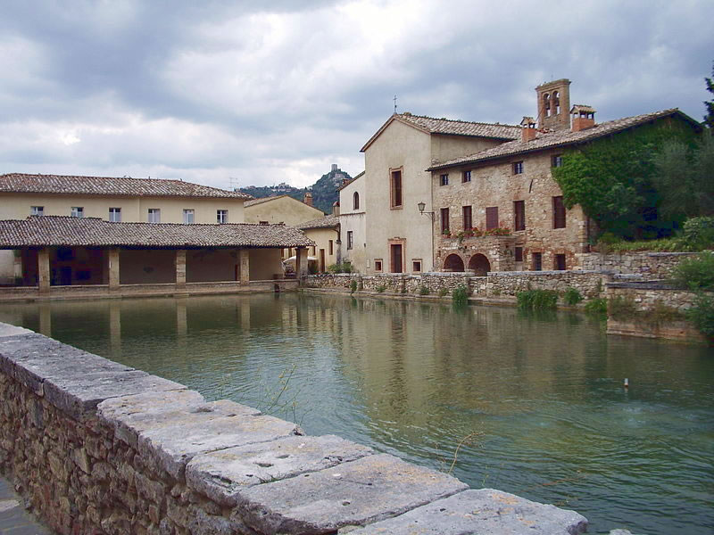 E' possibile immergersi anche nelle acque termali di Bagno Vignoni (13km.), conosciute fin dal tempo degli Etruschi e dei Romani. Il suo borgo conserva ancora l'antico aspetto urbanistico: la vasca, che contiene le acque termali, è posta al centro della piazza ed è chiusa per tre lati da una cinta muraria e nel quarto lato dal loggiato di Santa Caterina.